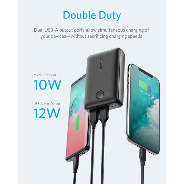 باور بانك من أنكر شحن ما يصل إلى جهازين في وقت واحد ويتضمن Power IQ لشحن عالي السرعة. 10000 مللي أمبير 2.4A الناتج الإجمالي يوفر 23 ساعة من الطاقة الإضافية سعة كبيرة في شكل محمول 2 منفذ يو اس بي