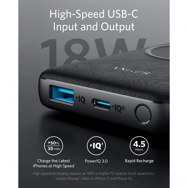 باور بانك من أنكر شحن وايرليس يتيح لك الشحن المعتمد من Qi والذي يصل إلى 10 واط شحن iPhone 11 بالكامل في أقل من 4 ساعات بغض النظر عن مكان وجودك يمتاز بمنفذ باور ديليفري 18 وات و يو إس بي 18 وات