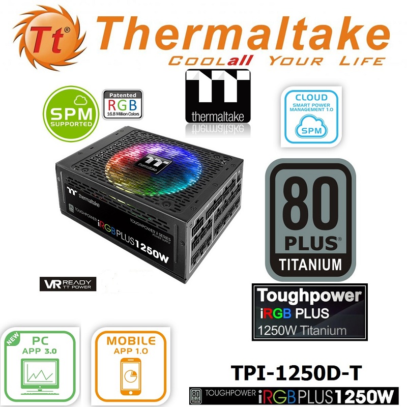 تعد Thermaltake Toughpower iRGB PLUS 1250W Titanium أول وحدة PSU في العالم مثبتة مسبقًا بمروحة RGB ذات 16.8 مليون لون حاصلة على براءة اختراع والتي تتضمن العديد من المكونات عالية التقنية والتكنولوجيا الرائدة والإشادات الصديقة للبيئة. تتميز بشهادة 80 PLUS Titanium مع كابل ذو غلاف فردي وكابل مسطح ، تتبنى سلسلة Toughpower iRGB PLUS Titanium مكونات عالية الجودة وتصميمًا معياريًا بالكامل يستوعب دائمًا أي بنية سائدة تحت أي ظرف من الظروف.إن الجمع بين Toughpower iRGB PLUS Titanium وثلاث منصات ذكية - DPS G PC APP 2.0 و DPS G Smart Power Management (SPM) Cloud 1.0 و DPS G Mobile APP 1.0 يساعد المستخدمين ليس فقط على مراقبة وحدات الإمداد بالطاقة الذكية ، ولكن أيضًا توفير الطاقة وتقليل انبعاثات ثاني أكسيد الكربون وحماية الأرض في النهاية.