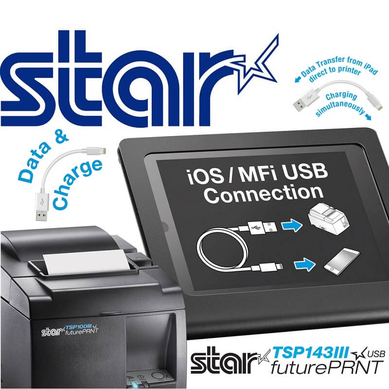 A standard USB receipt printer for traditional POS terminals (including Windows, Android, Linux, MAC), the TSP143IIIU can be used with a mobile tablet based system with direct printing from iOS devices via the supplied Lightning to USB cable, providing a truly versatile solution. Retailers can now combine the reliability of cabled terminal POS with the flexibility and advantages of mobile tablet POS without the Bluetooth or WiFi / wired LAN set-up issues around pairing, network infrastructure and connectivity.