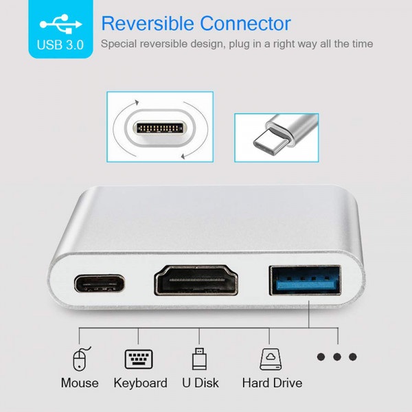 3 in 1. This Multiport adapter converts your type-C port to USB 3.0 port, HDMI video port and USB-C port