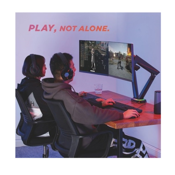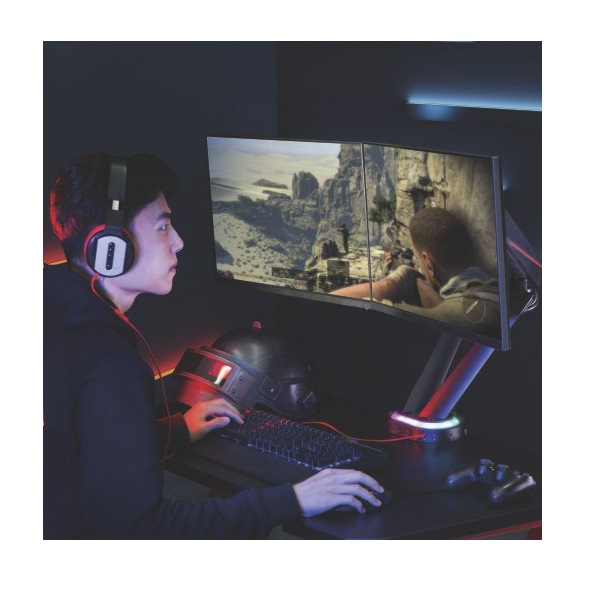 ●Detachable VESA Plate Design: enables easy installation ●Cool Lighting Effect: blends seamlessly into any gaming station ●Built-in Spring Tension Gauge: for perfect weight adjustments ●Built-in Cable Management: for an organized and neat workspace ●2 easily accessible USB 3.0 ports & 2 multi-media Ports ●Spring-Assisted Mechanism: allows to easily move up and down