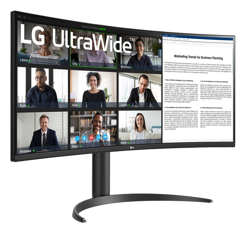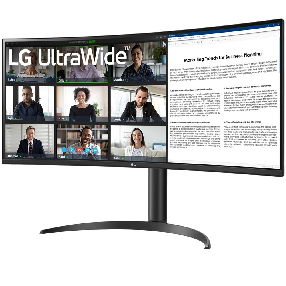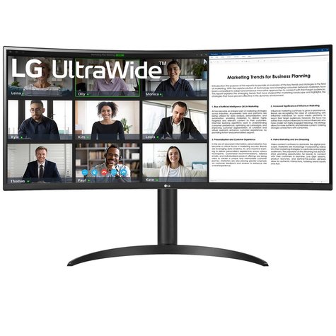 شاشة منحنية 34 بوصة WQHD (3440 × 1440) معدل تحديث 100 هرتز ومنفذ USB من النوع C 65 وات PD sRGB 99% (النوع)، معدل تباين 3000:1، HDR 10 AMD FreeSync™، مثبت أسود، مزامنة الحركة الديناميكية PBP، إدخال تلقائي مفتاح، وحدة تحكم مزدوجة، تحكم على الشاشة، تصميم بلا حدود تقريبًا من 3 جوانب وحامل قابل لضبط الإمالة/الارتفاع 2x HDMI 2.0 / 1x DisplayPort / 1x USB-C / 2x USB 3.0 / 1x 3.5 ملم صوت