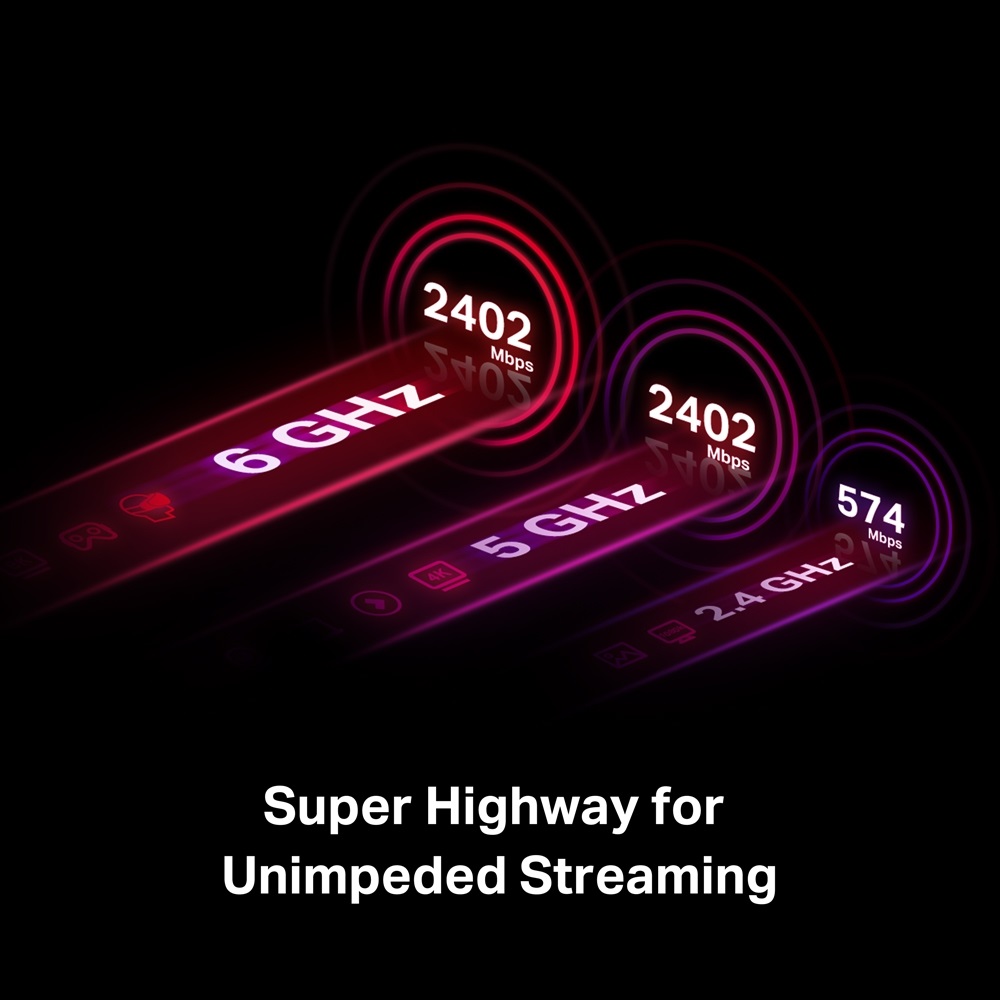 • سرعة ثلاثية الموجات لا مثيل لها  - عزز سرعاتك الإجمالية حتى 2402 ميجابت في الثانية (6 جيجاهرتز) + 2402 ميجابت في الثانية (5 جيجاهرتز) + 574 ميجابت في الثانية (2.4 جيجاهرتز)