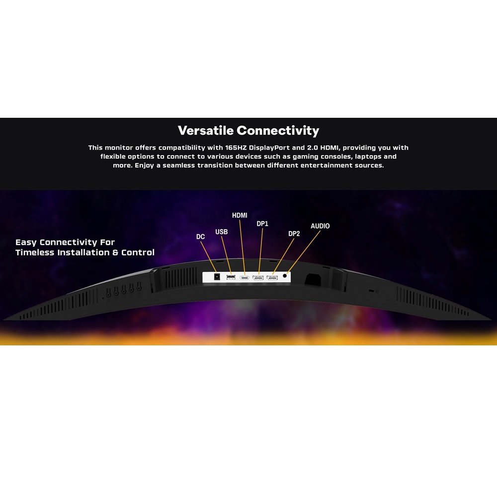 توفر هذه الشاشة التوافق مع منفذ DisplayPort بمعدل تحديث 165 هرتز ومنفذ HDMI 2.0، مما يوفر لك خيارات مرنة للاتصال بأجهزة مختلفة مثل وحدات التحكم في الألعاب وأجهزة الكمبيوتر المحمولة والمزيد. استمتع بانتقال سلس بين مصادر الترفيه المختلفة.