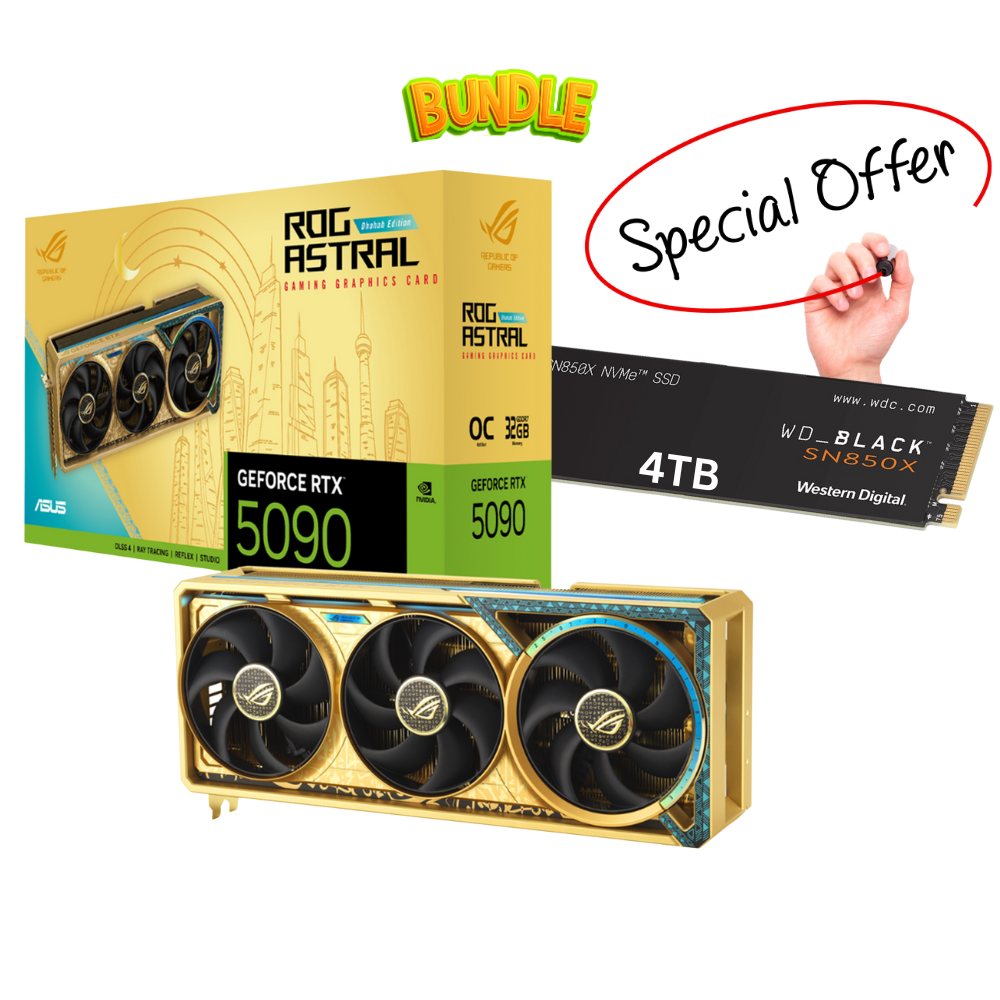 - حزمة ASUS: بطاقة الرسومات ROG Astral GeForce RTX 5090 Dhahab OC Edition بسعة 32 جيجابايت مع وحدة تخزين WD SN850X M.2 SSD بسعة 4 تيرابايت