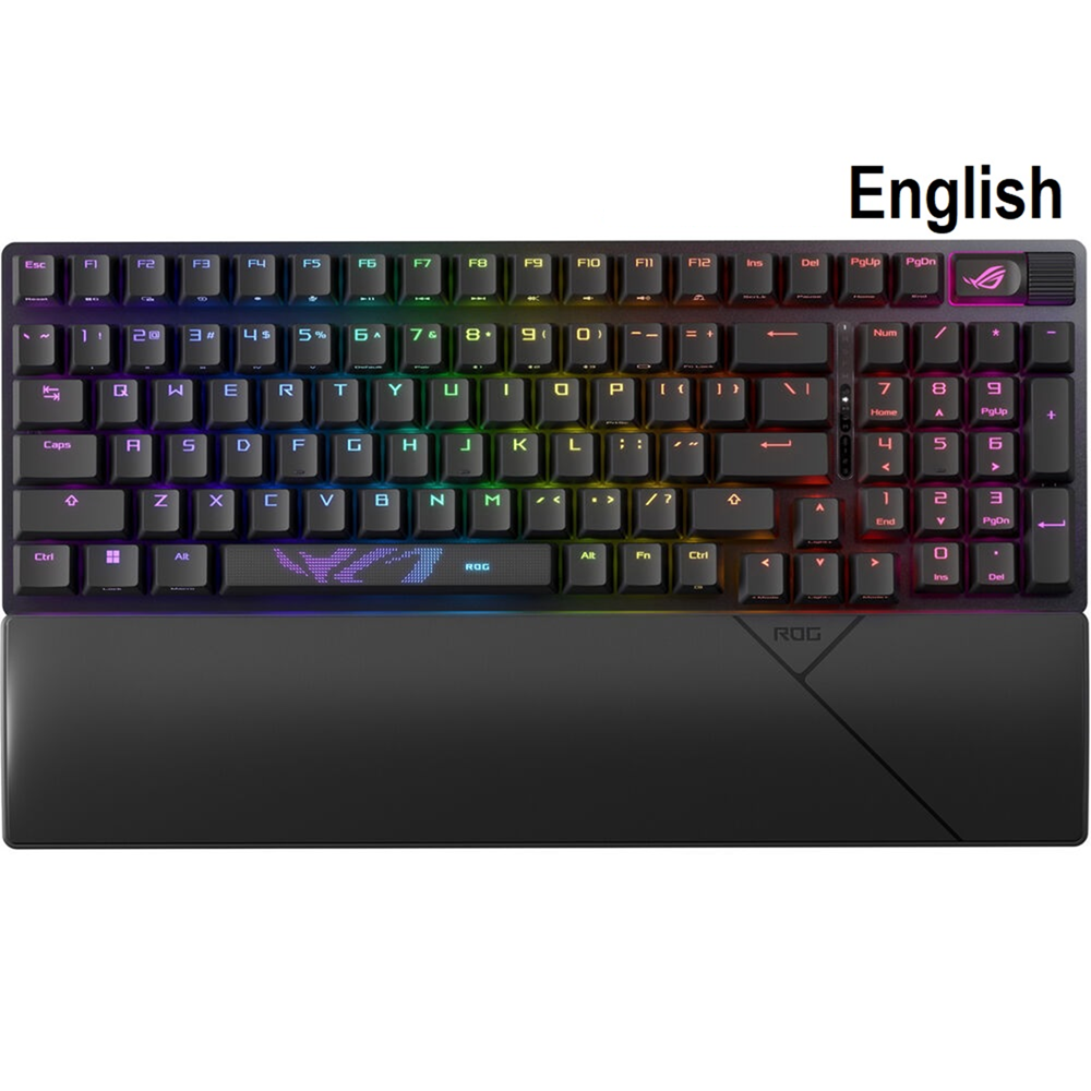 لوحة مفاتيح ألعاب لاسلكية باتصال ثلاثي الأوضاع، مع مفاتيح مخصصة للبث، وعناصر تحكم متعددة الوظائف، ومفاتيح ميكانيكية ROG NX Snow & Storm قابلة للتبديل ومشحمة مسبقًا، ومثبتات مفاتيح ROG، وأغطية مفاتيح PBT مزدوجة الحقن، ورغوة سيليكون لتخميد الصوت، وثلاث زوايا إمالة، ومسند معصم.