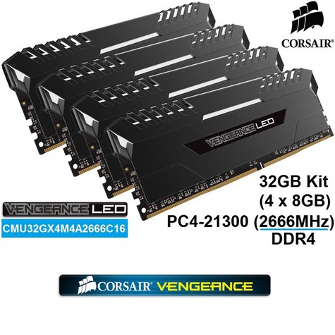كورسير 32 جيجا 2666 ميجا هرتز DDR4 RAM VENGEANCE LED (4 × 8 جيجا بايت) مجموعة ذاكرة DRAM - أبيض LED (CMU32GX4M4A2666C16)