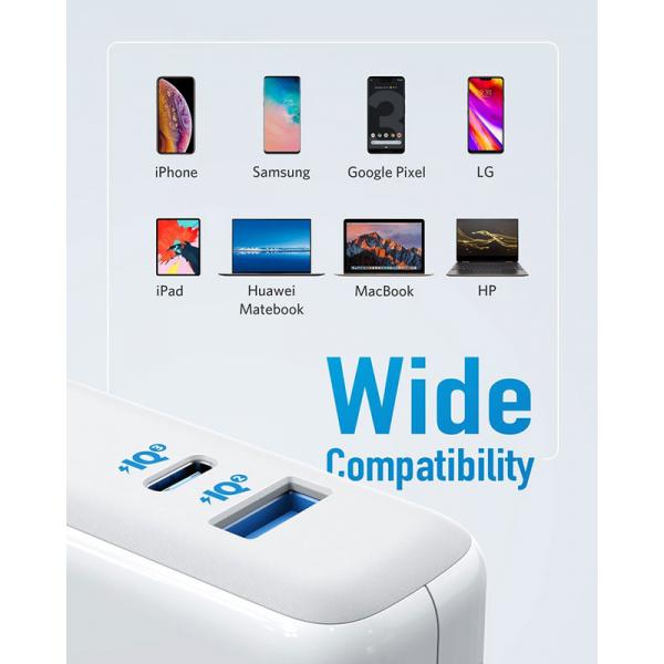 One for All - Compatible with virtually any device that can be charged via USB; with a USB-C PowerIQ 3.0 port and a USB-A port equipped with PowerIQ 2.0. Compact Size - 15% smaller than an out-of-the-box MacBook charger, with all of the power—and double the ports. Powered by GaN - Swapping out silicon for gallium nitride (GaN) has allowed us to take our world-famous charging technology and shrink it way down. Introducing PowerIQ 3.0 Our most advanced charging technology ever charges virtually any device at its fastest possible speed. PowerIQ 3.0 provides full-speed charging with support for Qualcomm Quick Charge and USB-C Power Delivery for phones, tablets, laptops, and more. Double Duty: Charge all of your devices with one USB-C PowerIQ 3.0 port (45W) and one USB-A PowerIQ 2.0 port (15W). Greater with GaN By being the first charging brand ever to swap out silicon for super-efficient gallium nitride (GaN) semiconductors, we’ve been able to take our signature technology and shrink it way down. Compatible with Phones: iPhone XS / XS Max / XR / X / 8 Plus / 8 / 7 / 7 Plus / 6; Samsung Galaxy S10 / S10e / S10+ /S9 / S9+ / S8 / S8+ / Note 9 / Note 8; Huawei P10 / Mate 9 / Mate 20X / Mate 20 Pro; LG G7 / V30+, Google Pixel / Pixel 3XL / 3 / 2XL / 2, Nexus 5X / 6P, Sony XZ2 Premium, Sony XZ3, and more Tablets: iPad Pro 12.9'' / iPad Pro 10.5'' / iPad Pro 11'' Laptops: MacBook Air 13''(2018) / MacBook 12'' / MacBook Pro 13'' / MacBook Pro 15''/ Spectre 360 / YOGA730, and Xiaomi Air. and More