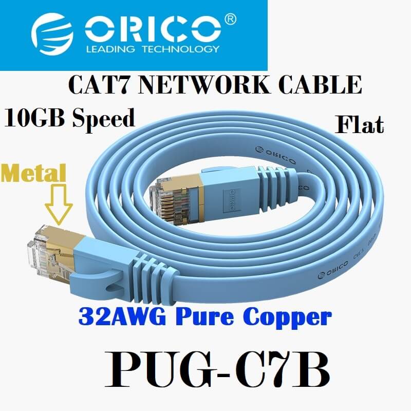 Orico CAT7 Network 1Meter Flat Cable 10GB Speed, 32AWG Pure Copper Wire, Metal Modular, PVC Coating, 8Core Structure, Oxygen Free, 24K Gold Plated PIN, Waterproof, Sun block, Freeze Resistant, Soft and Smooth Ethernet, Light Blue, PUG-C7B-10-BL
