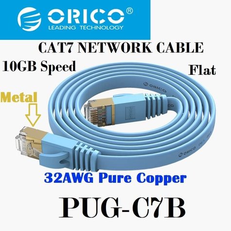 Orico CAT7 Network 3Meter Flat Cable 10GB Speed, 32AWG Pure Copper Wire, Metal Modular, PVC Coating, 8Core Structure, Oxygen Free, 24K Gold Plated PIN, Waterproof, Sun block, Freeze Resistant, Soft and Smooth Ethernet, Light Blue, PUG-C7B-30-BL
