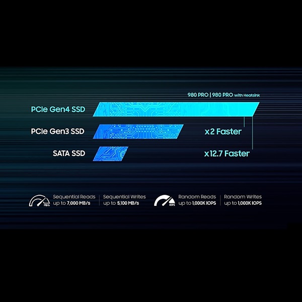 980 PRO is backward compatible with PCIe 3.0. Sequential performances (up to): 3450 MB/s (1TB), 3470 MB/s (2TB) for writes. Random (up to): 690K IOPS (1TB), 680K IOPS (2TB) for reads, 660K IOPS (1TB), 630K IOPS (2TB) for writes.
