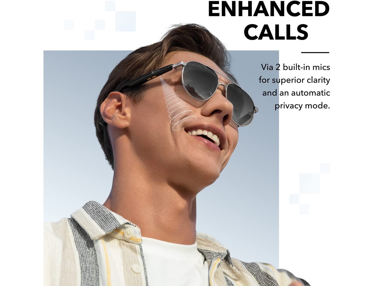 Anker Soundcore Frames Tour -Black OpenSurround Audio System 4 Speakers Positioned Around your Ears For a tailored listening experience, choose from 7 levels 2 Microphones work in tandem with a Noise Reduction Algorithm Combines Sleek Stainless Steel Frames with Polarized Lenses Can block out up to 99% of UVA/UVB rays Scratch- & Shatter-resistant. Lightweight Materials, Hinges flex up to 8 Degrees 10 Mins of charging gives you 90Mins of Listening Control via Soundcore App