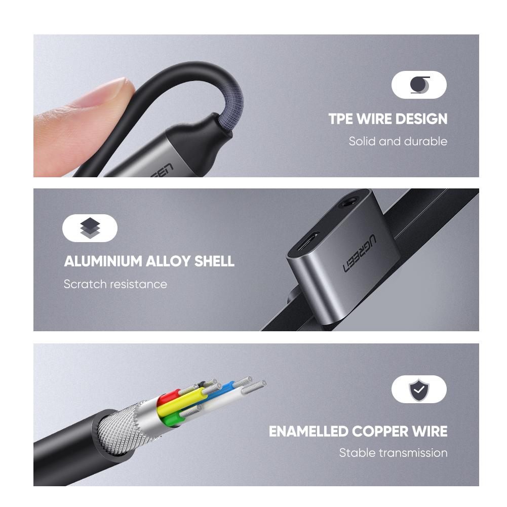 :Built-in filter capacitor and multi-layer shielding to filter the noise. The enameled copper inside ensures a stable and clear sound, to provide you a flawless audio experience. UGREEN USB C to 3.5mm stereo audio headphone adapter made of Hi-Q aluminum alloy shell connector and durable TPE jacket. It is essessial for people who wanna charge and listen to music simultaneously.