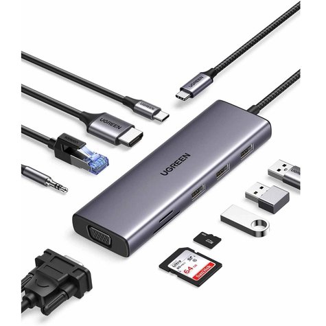 - UGREEN CM498 USB-C 10in1 Hub Multifunction Adapter 100W, HDMI, VGA, LAN. Card Reader