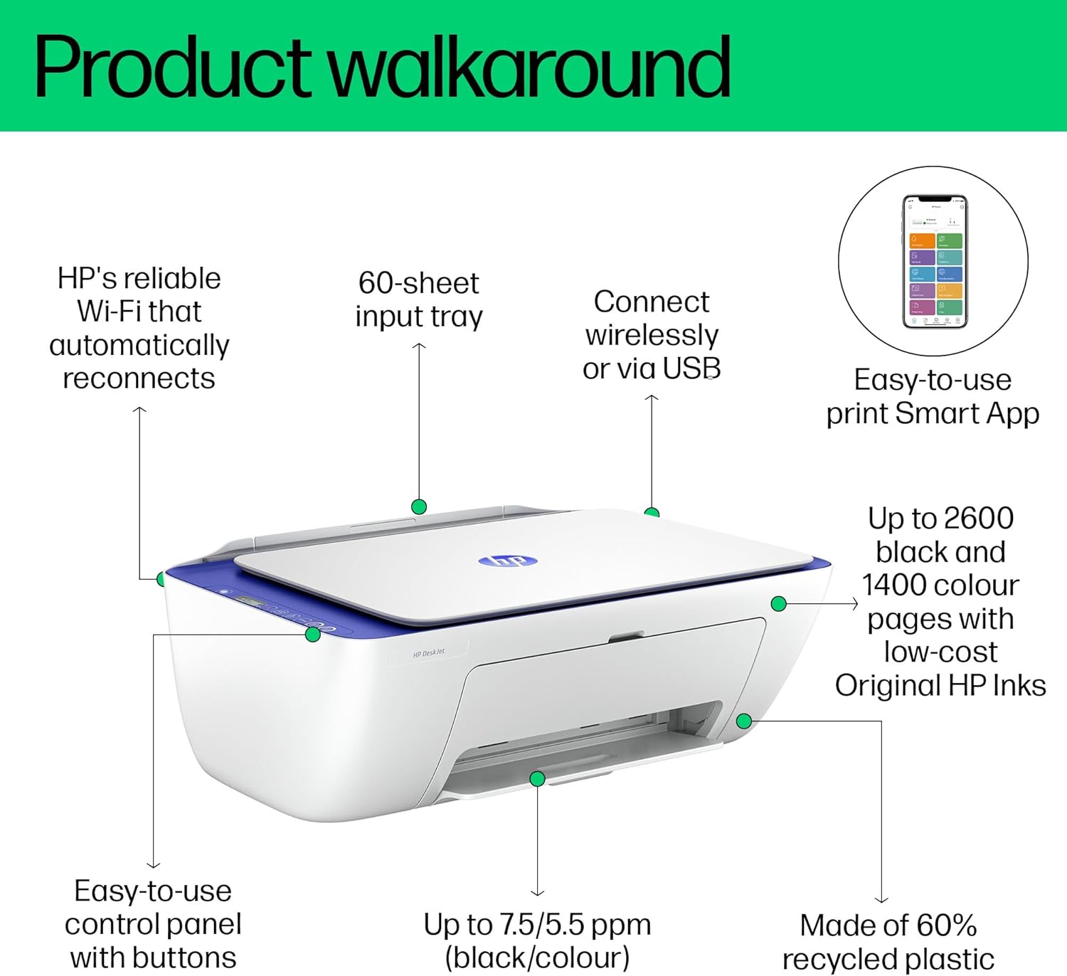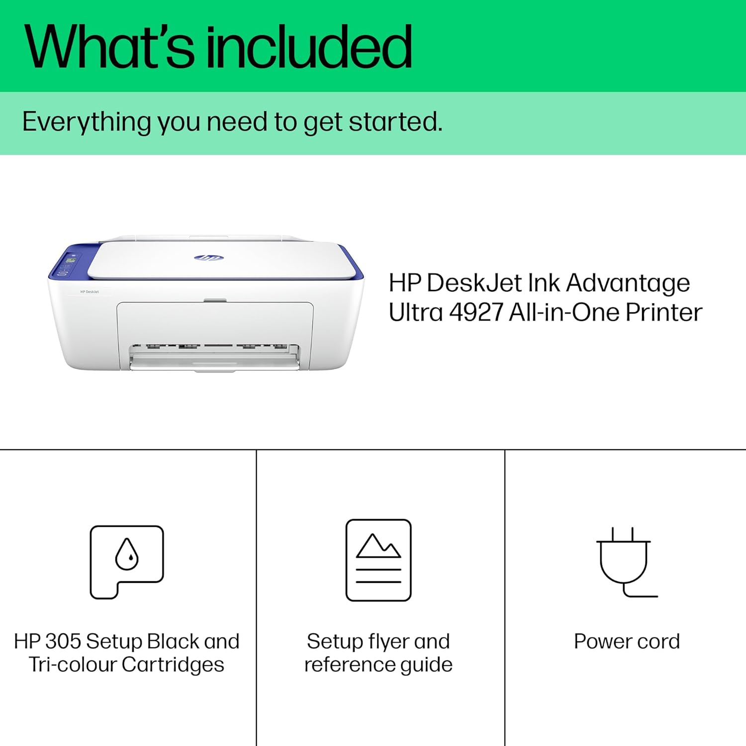 The HP DeskJet Ink Advantage Ultra 4927 is a compact all-in-one printer offering print, scan, and copy functions with wireless connectivity. It delivers print speeds up to 7.5 ppm (black) and 5.5 ppm (color), and supports high-yield ink cartridges for cost-effective printing.