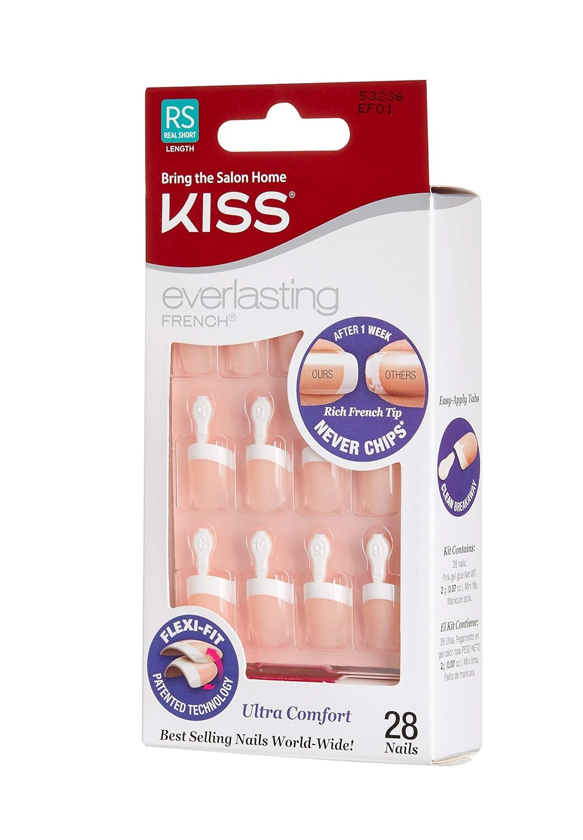 Application: Clean nails with acetone polish remover; select correct size nail for each finger and set aside in order. Nails are sized by number, noted on easy-apply tab. 1. Apply glue to back of artificial nail. 2. Apply glue to natural nail. 3. Align with cuticle, press on & hold for 5 seconds. 4. Remove tab by bending down, then up. Expert tip: apply enough glue to avoid air pockets, secure adhesion, and extend wear. Removal: Do not force or pull nails off. Trim & file surface to disrupt protective top coat. Soak nails in Kiss® All or One™ artificial nail remover or acetone polish remover until soft. Wipe off softened nails & glue.
