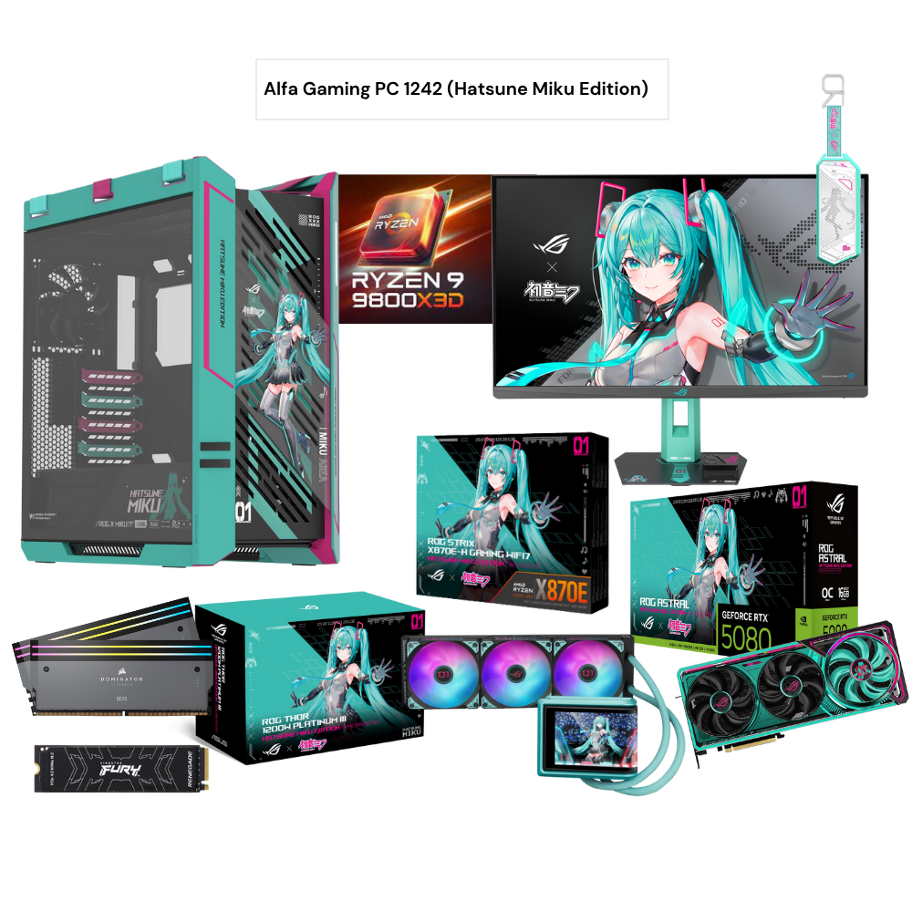 Alfa Gaming PC 1242 AMD Ryzen 7 9800X3D Processor ASUS ROG Ryuo IV 360 ARGB Hatsune Miku Edition ROG Thor 1200W Platinum III Hatsune Miku Edition ASUS ESD-S1C ROG Strix Arion Hatsune Miku Edition ASUS GX601S ROG Strix Helios II Hatsune Miku Edition ASUS 27″ ROG Strix XG27ACMEG-G Hatsune Miku Edition ASUS ROG Strix X870E-H Gaming WiFi7 Hatsune Miku Edition ROG Astral GeForce RTX 5080 GDDR7 OC Hatsune Miku Edition