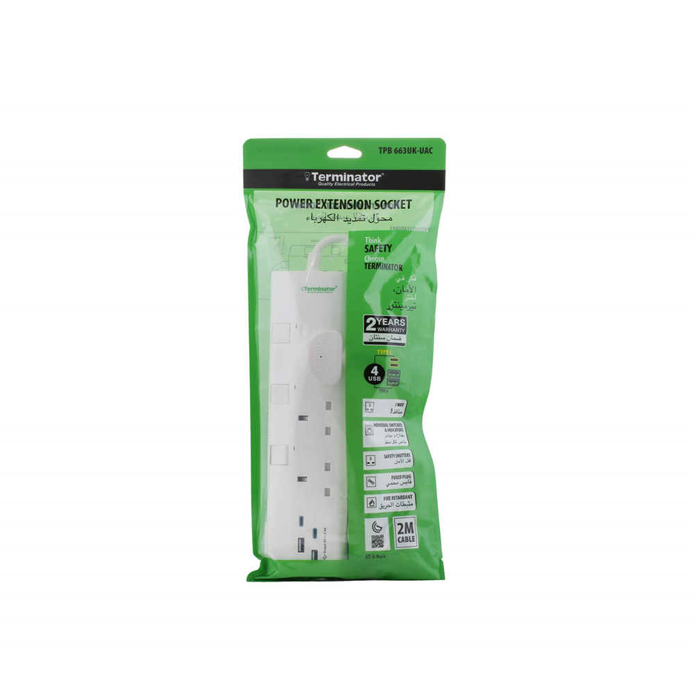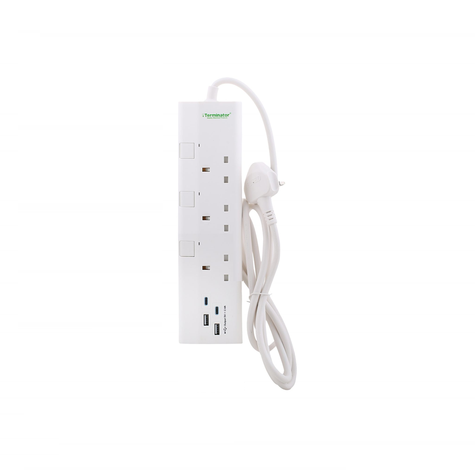 • Terminator 663UK 3-AC Outlet Power Extension Strip UK Socket 2M & 13A, 4 USB Charging Ports